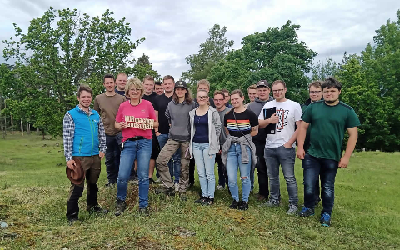 Alljährlich findet mit Schülerinnen und Schülern der Landwirtschaftsschule Münchberg eine Exkursion zu Landschaftspflegeflächen statt. Dabei zeigen Regina Saller vom LPV (1. Reise, zweite von links) und Stefan Braun (Biodiversitätsberater des Landkreises Hof, vorne links), dass die Landschaftspflege bzw. der Vertragsnaturschutz eine zusätzliche Einkommensquelle für Landwirtinnen und Landwirte sein kann (Foto: Lisa Schwemmlein).