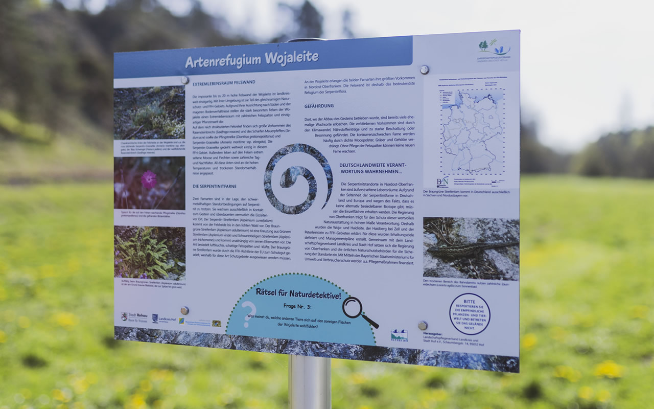 Wussten Sie, dass es im Hofer Land ein seltenes, schwermetallhaltiges Gestein gibt, auf dem einzigartige Pflanzen gedeihen? Bei Woja und Wurlitz können Sie einige dieser Felsstandorte entlang des neuen LPV-Wanderwegs „Mit dem Schlangenstein um die Wurlitzer Alm“ besichtigen. Der Wanderweg wurde mit Abschluss eines vom Bayerischen Umweltministerium geförderten Projekts im April 2025 eingeweiht (Fotos: Landkreis Hof). Weitere Infos zum Projekt und dem Wanderweg finden Sie unter Projekte/ Serpentinit